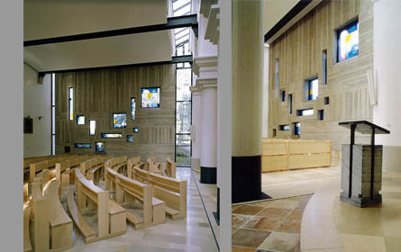CHURCH IN VIENNA-ASPERN, VIENNA 1994-1999 The Baroque church is extended by a structure with an arced wall. Through the sliced west wall, the nave opens out towards the new space, which is bounded by three elements: the white rendered rear wall, a freestanding fair-faced concrete wall plate and, above these, the ceiling its steel joists and the shallow vaulted ceiling bowls. Whilst unbroken daylight falls into the space through the glazed seam, it is filtered many times over by the twelve colourful stained-glass windows. The reduction to just a small number of materials emphasises the austere reserve of the new annexe: Kehlheim stone flags, grey limestone for the altar and ambo, black steel for windows and beams, as well as roughcast concrete and white rendered wall and ceiling areas. Here, the historical fabric has been developed further, so that the architecture of this sacred place appears fragmentary, in much the same way as our own existence. |
